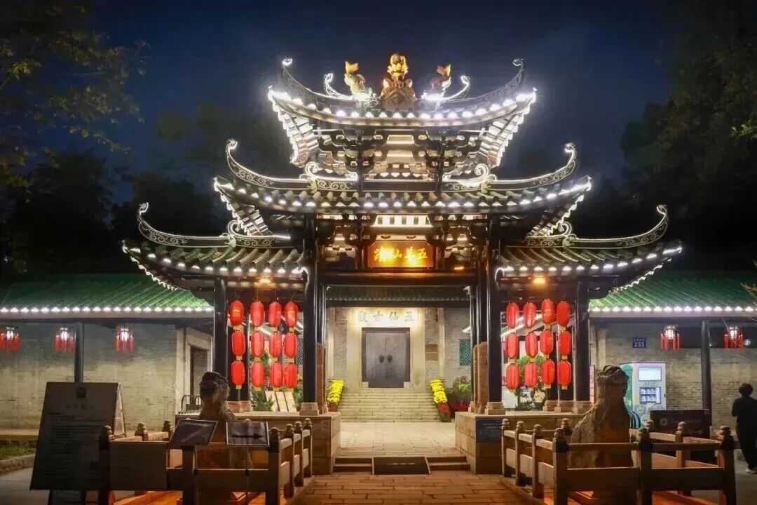 五仙观迎来年度最浪漫时刻。五仙观牌坊连续延时开放至晚8时。广式红木宫灯温润如月,非遗鱼灯摇曳流光,点缀于头门、牌坊层层灯影叠入夜色,重现“花市灯如昼”的广府元宵盛景。