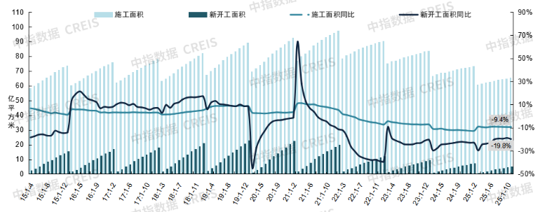 房屋施工面积:1-10月,全国房屋施工面积为65.29亿平方米,同比下降9.4%;其中,住宅施工面积为45.53亿平方米,同比下降9.7%。