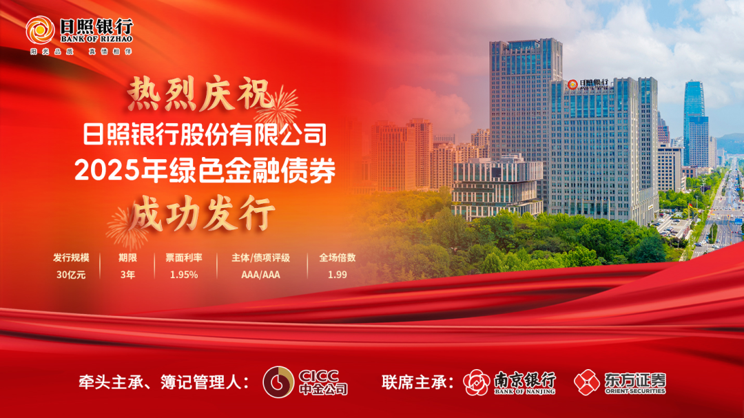11月12日,日照银行在全国银行间债券市场成功发行2025年绿色金融债券。本期债券主体评级AAA,债项评级AAA,发行规模30亿元,期限3年,发行利率1.95%,募集资金将全部用于《绿色债券支持项目目录(2025年版)》规定的绿色产业项目。